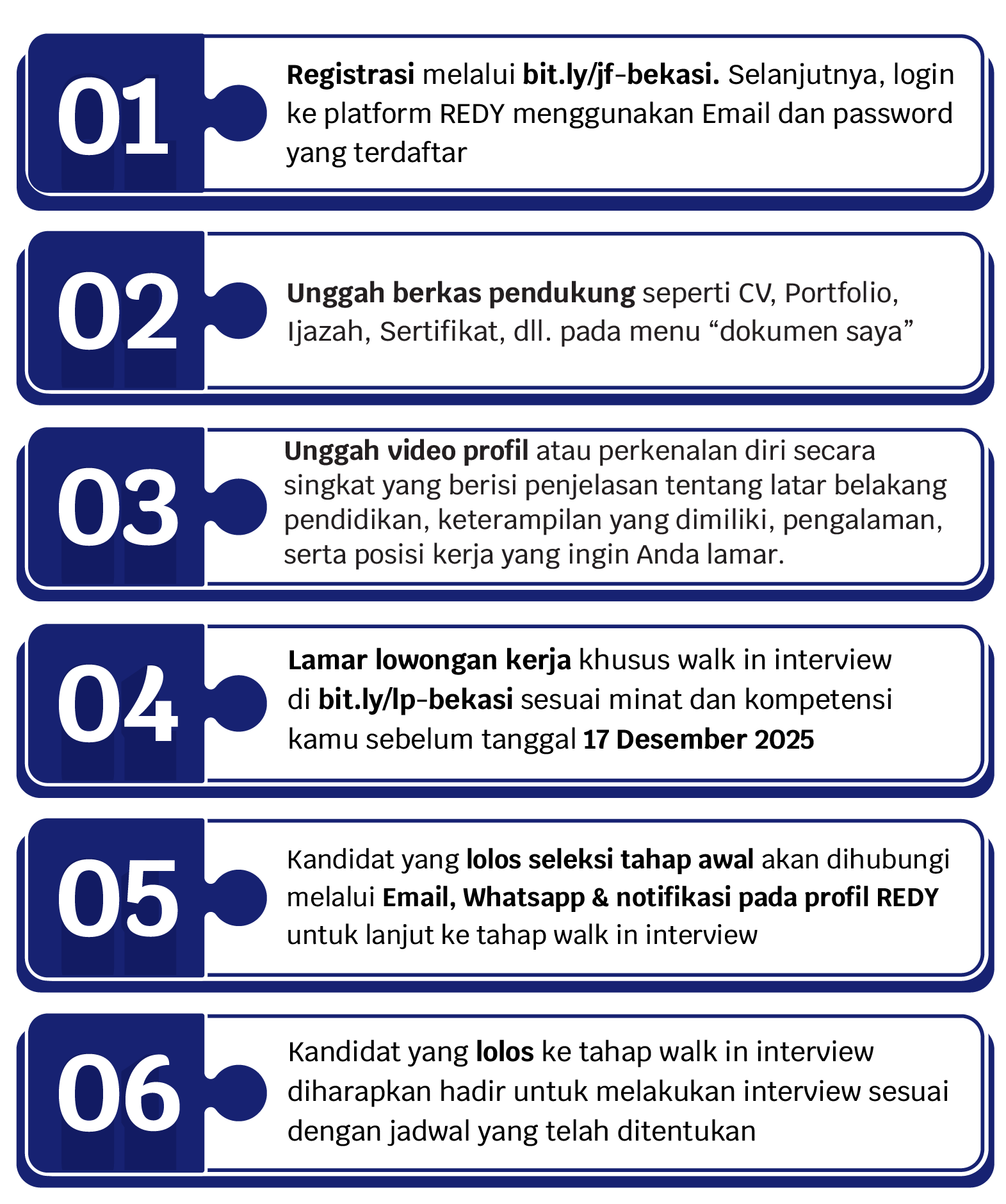 22 Desember 2025 GWFoodJl. Festive Garden No. 60,Lambangsari, Kec. Tambun Selatan,Kabupaten Bekasi, Jawa Barat. Tata Cara Mengikuti Walk in InterviewDisnaker Kabupaten Bekasi 2025 Perusahaan yang mengikuti Walk in interview Lamar Sekarang Lamar Sekarang Lamar Sekarang Lamar Sekarang Lamar Sekarang Belum Punya Akun REDY? Daftar Sekarang Tutorial Menggunakan Website atau App REDY Powered By